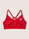 Lightly lined, wireless Removable padding Pull-on style V-neckline with adjustable straps PINK logo elastic bottom band Low impact, 4-way stretch, wicking fabric, quick dry fabric Imported: recycled polyester/elastane/polyamide.