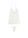 Get glamorous in georgette, with pretty pleats, a shiny ribbon bow and a matching thong panty. Triangle lace cups. Empire waist with satin bow. Adjustable straps. Matching thong panty.
