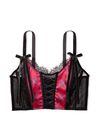 It doesn't get more romantic than this. Lace yourself up in a shape-enhancing corset bra-cut from luxe satin, with feminine. Chantilly trim, and pretty velvet details. Unlined. Underwired. Adjustable straps. Back hook-and-eye closures. Scoop neckline. Boning throughout. Scalloped lace trim. Ribbon detail at front.