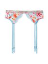 Dazzling rhinestones, floral-print satin, and scalloped lace accents make this suspender belt the star of a statement-making lingerie look. Rhinestone shine waistband. Adjustable garter straps. Hook back closure.