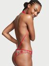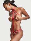 Coming up roses with sparkly accents, open cups, and a completely ouvert silhouette. Embellished bows add something extra to this barely-there style. Open cups. Ouvert bottom. Shimmer rose embroidery. Embellished bow details. No back coverage. Pull-on design with G-hook halter neck. Hand wash.