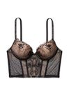 Treat yourself to a bold bra top with dotted mesh details, black rose embroidery, and metallic gold thread, plus the push-up technology you know and love. A row of embellished bows finishes the look. Push-up padding adds one cup size. Underwired. Adjustable straps. Back hook-and-eye closure. Velvet logo straps. Embellished bow details. Boning throughout.