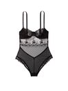 A figure-flattering teddy with dotted mesh, scalloped lace, and metallic details, plus a bold cutout at the back. Featuring the Wicked cup technology you love for form and definition. Unlined with an innovative sling to provide push-up without padding. Adjustable straps. Back hook-and-eye closures. No back coverage.