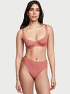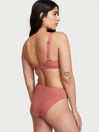 Our ribbed swim fabric adds a touch of texture to this flawless high-rise style. A tiny logo charm at the back leans into the understated glamour. Swim bottoms feature high rise with high-cut leg and cheeky fit: moderate back coverage; shows a little but not all.