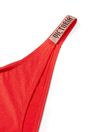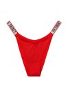 Cali-cool with plenty of glam, this cheeky bikini dazzles with shine straps that catch the sun. Low rise. High-cut leg. Logo shine strap sides. Minimal back coverage, lots of cheek peek.
