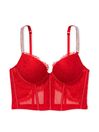 Sheer mesh panels meet beautiful floral lace in this long line push-up bra top, finished with our signature rhinestone shine straps. Boning throughout provides structure and flatters the figure. Features: Push-up padding adds 1 cup size. Underwire. Adjustable straps. Hook-and-eye closures at back. Rhinestone shine straps. Boning throughout. Hand wash.
