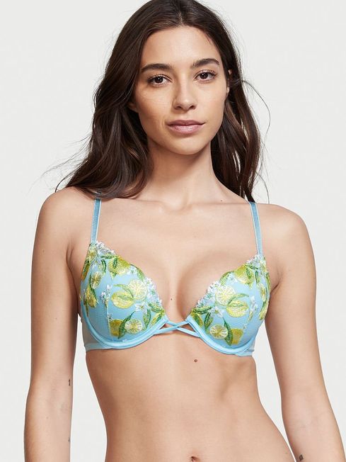 Our dreamy new collection is ripe for the picking, embroidered with delicate fruit stitched by hand. This romantic push-up is kissed with sweet lemon appliques on fine tulle. It combines the confident lift you love with a plunge neckline and pretty, twisted ribbon detail between the cups. Push-up padding. Underwire. Adjustable straps. Back hook-and-eye closure. Fruit embroidery on tulle. Twist-front lace-up detail. Partially made with recycled materials. Hand wash.
