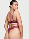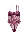 A sheer bodysuit decorated with floral embroidery, featuring the Wicked cup technology you love for form and definition. Unlined with innovative sling to provide push-up without padding. Adjustable straps. Back hook-and-eye closure. Thong bottom. No back coverage.