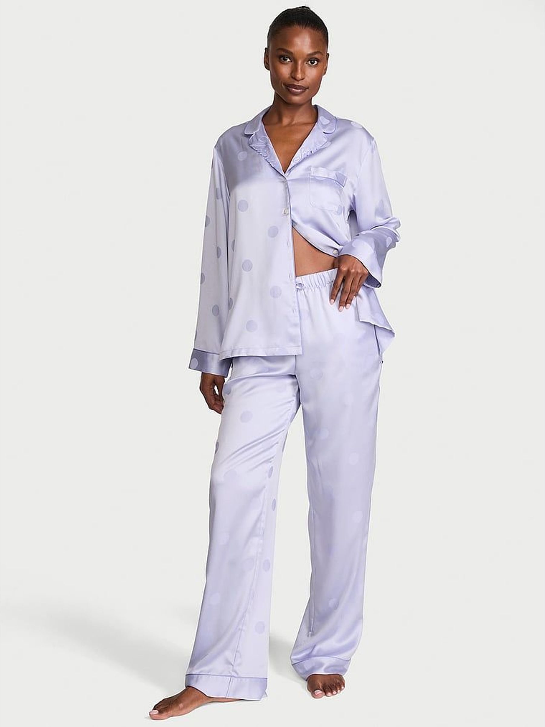 Icy Lavender Purple Polka Dot Satin Long Pyjamas Set