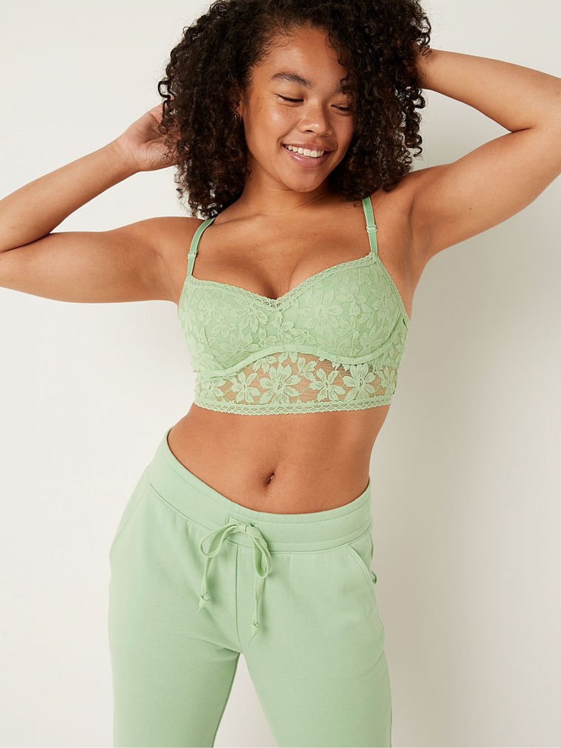 Structured, underwire cups. Push-up padding. All over floral lace. Adjustable straps with strappy back. Hook-eye back closure.